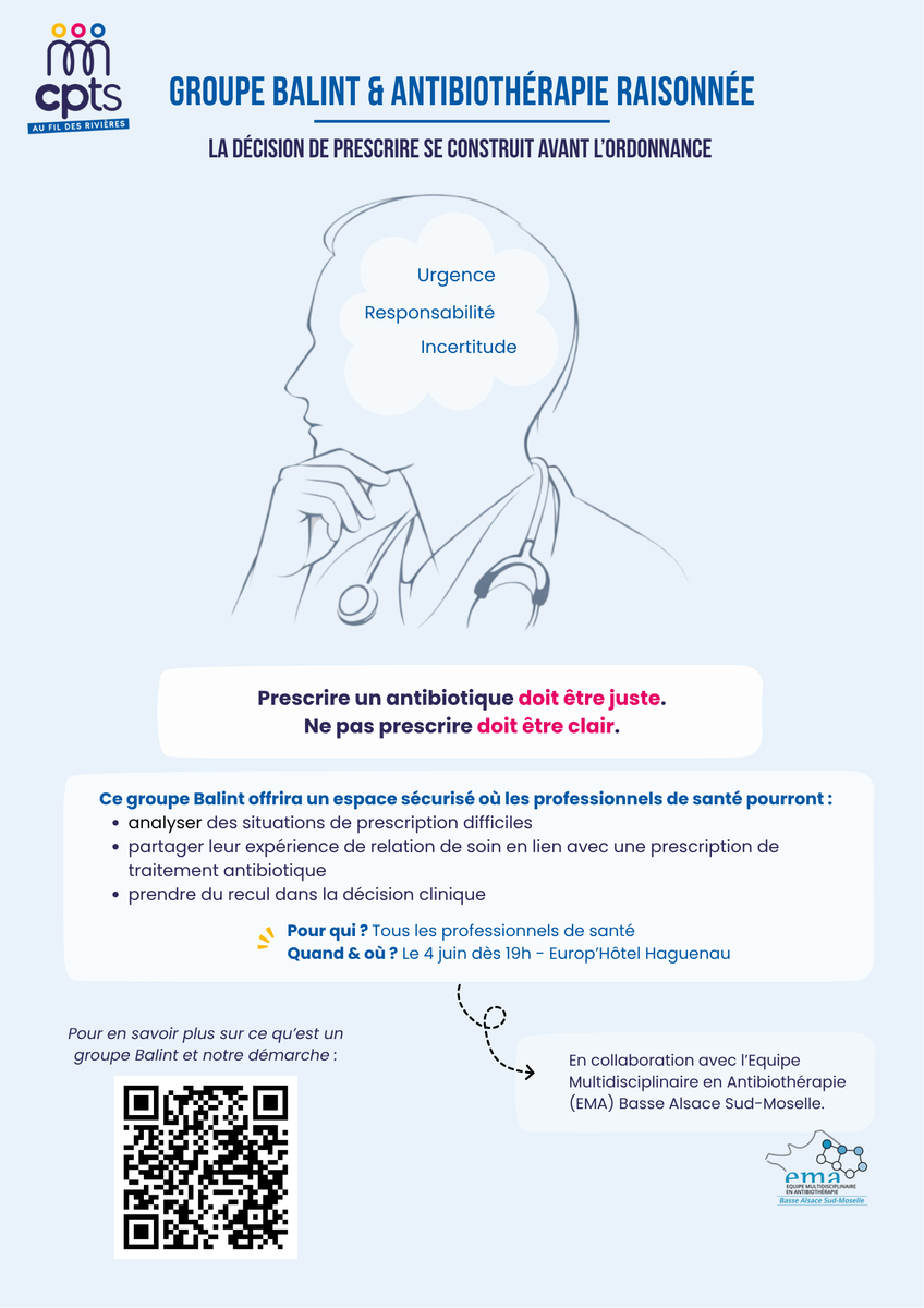 En juin, nous organiserons une rencontre Balint réunissant professionnels de santé hospitaliers et de ville, en collaboration avec l’Équipe Multidisciplinaire en Antibiothérapie du territoire. L’objectif est de réfléchir collectivement à la décision de prescrire ou non des antibiotiques, en tenant compte des inquiétudes et pressions des patients.