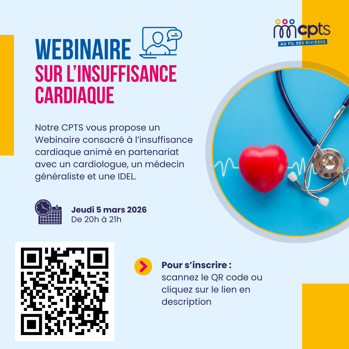 Un webinaire sur l’insuffisance cardiaque est organisé pour le jeudi 5 mars 2026 à 20h. Celui-ci sera principalement animé par un cardiologue libéral accompagné d’une IDEL et d’une médecin généraliste, notamment afin de mettre en avant les bénéfices du suivi infirmier sur la question de la prise en charge médicamenteuse.